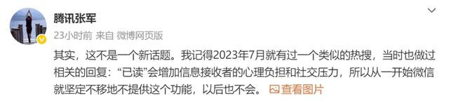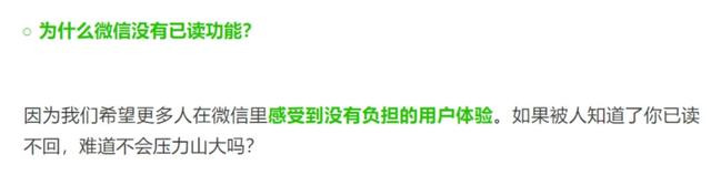 “已读”会增加信息接收者的心理负担和社交压力,所以从一开始微信就坚定不移地不提供这个功能,以后也不会。之前腾讯公开课上也说过,希望更多人在微信里感受到没有负担的用户体验,如果被人知道了已读不回,那肯定会压力山大。